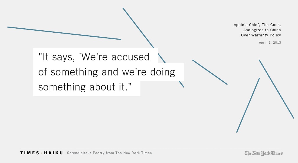 Here’s how “serendipitous poetry” works: an algorithm scans recently published Times articles for sentences that fit a haiku’s requisite 5-7-5 syllable scheme. The machine spits out some true verse—and some duds. Curators choose the best ones, and publish them on the newly created Times Haiku blog.